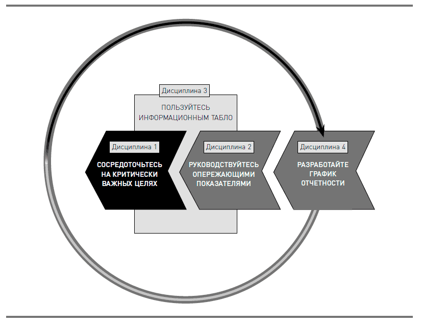 Информационное табло (дисциплина № 3) занимает центральное место, потому что выставляет на всеобщее обозрение показатели успешного достижения целей.