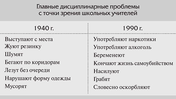 Сегодняшние дисциплинарные проблемы в школах не идут ни в какое сравнение с тем, что было в 1940 году. Тогда школьников ругали за жвачку и беганье по коридорам, а сегодня на первый план вышли подростковая беременность и насилие.