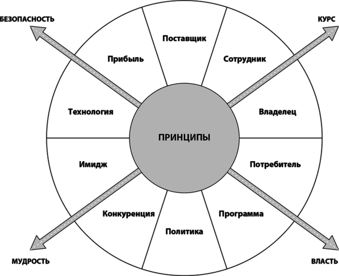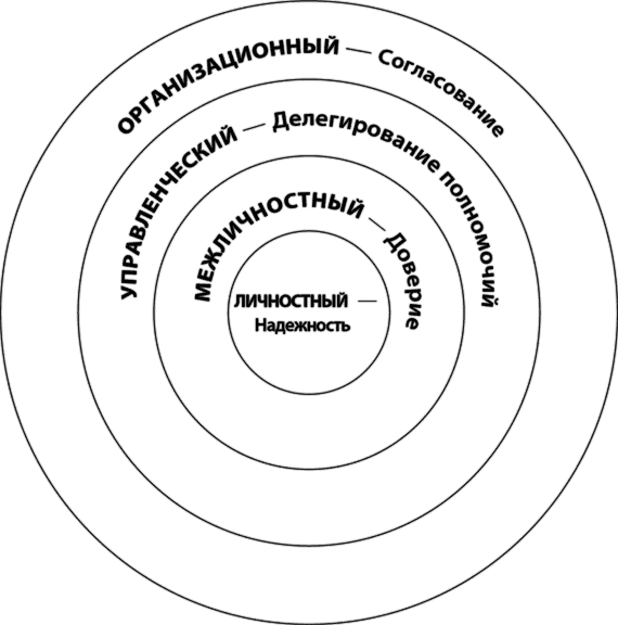Принцип-центричное лидерство осуществляется изнутри наружу на четырех уровнях: 1) личном (мои отношения с самим собой); 2) межличностном (мои отношения и взаимодействие с другими людьми); 3) управленческом (я ответствен за то, чтобы работа была выполнена другими людьми) и 4) организационном (я должен организовывать людей – нанимать их, обучать, оплачивать их труд, создавать команды, решать проблемы, создавать согласованные структуры, стратегии и системы).