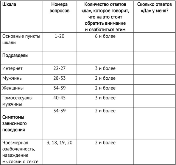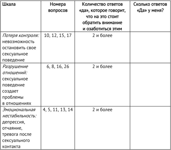 Этот тест был разработан совместно с клиниками, психотерапевтами, группами поддержки и используется с 1983 года, чтобы понять, существует ли у человека компульсивное или «зависимое» сексуальное поведение или его нет.