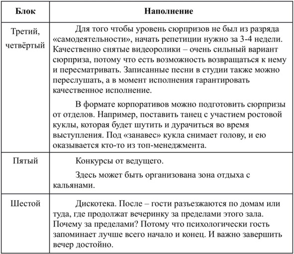 Банкет. Если регистрация – это официальная часть, где «всё серьёзно», то на банкете можно расслабиться. Делится он, как правило, на 5—6 блоков. Один блок – 45 минут. Логика проста: ровно столько минут комфортно, чтобы человек воспринимал информацию и не «уплывал» мыслями в постороннее, далее нужна перезагрузка, отдых. После каждого блока устраиваем 15-20-минутный перерыв. Первые 4—5 блоков – торжественная часть под управлением ведущего, финальный блок – дискотека.