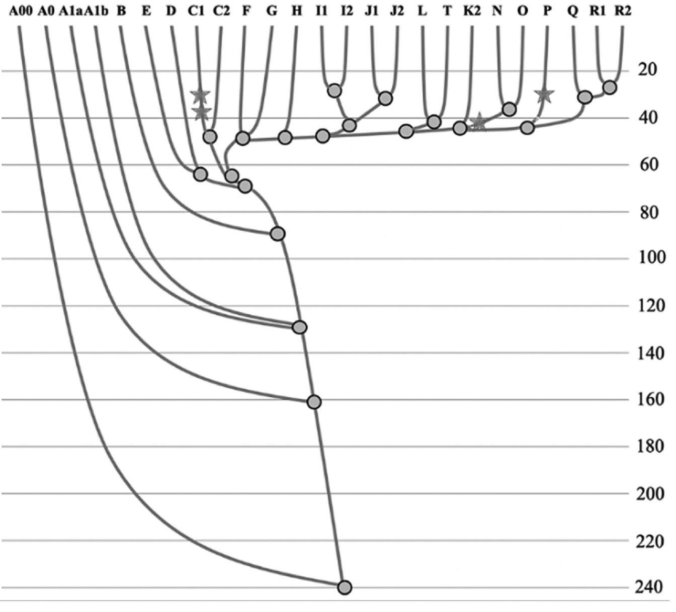 Генеалогическое древо Y-хромосомных гаплогрупп ныне живущих людей. (Звёздочками слева направо помечены позиции, занимаемые на древе людьми эпохи палеолита из Владимирской (Сунгирь), Воронежской (Костенки) и Омской (Усть-Ишим) областей и Якутии (Усть-Яна), у которых была расшифрована ископаемая ДНК (их мы подробно рассмотрим в главе о кривичах).