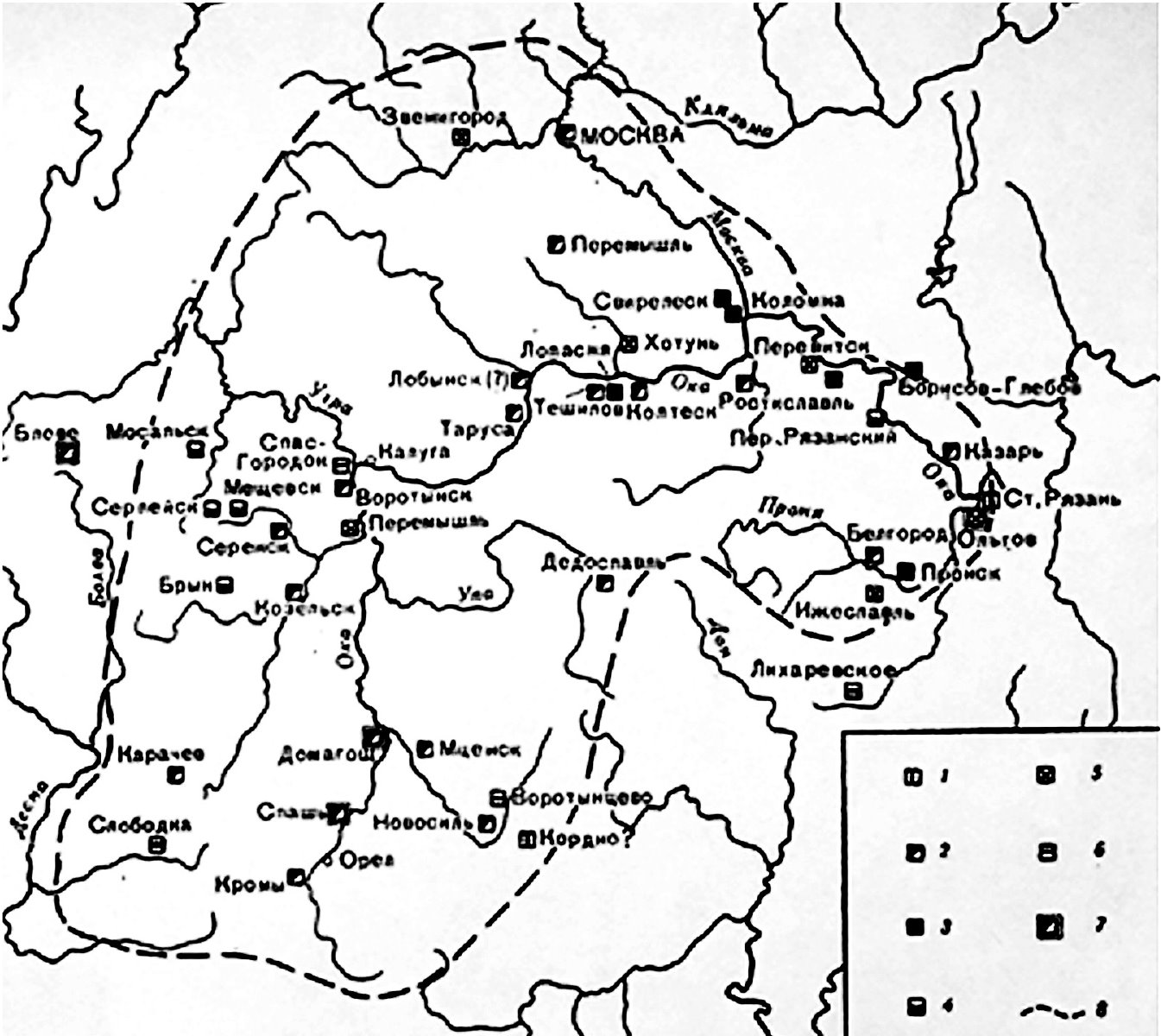 Города в Земле вятичей в XII-XIII вв. (из книги Т. Н. Никольской «Земля вятичей», 1981г., изд-во «Наука»)