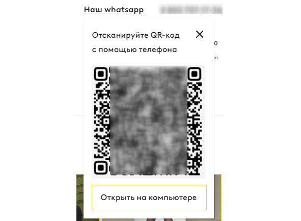 Для мобильных версий сайта достаточно иконок соцсетей с переходом в соответствующее приложение. А если пользователь зашел с компьютера, то можно предложить ему очень удобную штуку – отсканировать QR код, в котором зашита ссылка на ваш мессенджер, как это сделано на примере ниже.
