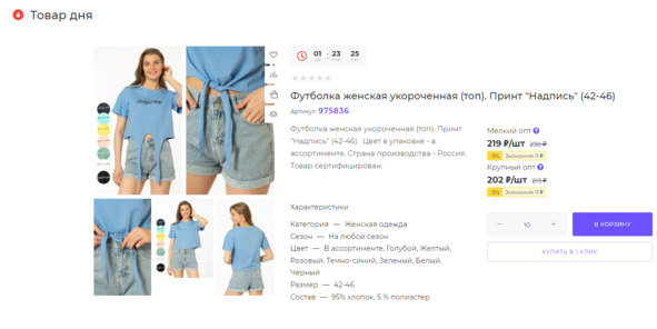 Вот пример из оптового интернета-магазина одежды. Здесь мы видим набор опций, который часто нужен покупателям. Клиенту всегда нравится, что о нем подумали заранее и предложили полный комплекс, а не просто товар.