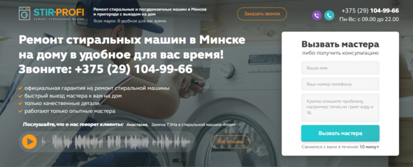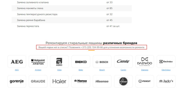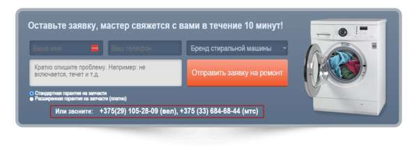 Важно: призыв должен быть в контексте текущего блока страницы. На примере выше идет речь о бренды стиральных машин, поэтому и призыв в подзаголовке логично связан. Согласитесь, здесь было бы неуместно указать что-то вроде «Позвоните для вызова мастера». Также важно не перегрузить страницу призывами. Они, как специи, нужны очень дозированно.