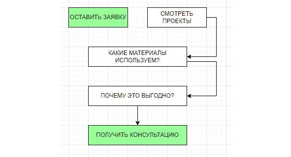 Нажав на «Смотреть проекты» посетитель переходит на экран со списком проектов, внизу которого видит кнопку «Какие материалы используем». Нажав на эту кнопку, он попадает на блок с описанием материалов и видит кнопку «Почему это выгодно». Нажимает на кнопку и переходит в блок преимуществ, где видит кнопку «Получить консультацию» и отправляет заявку.