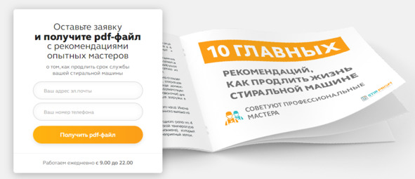 Часто на сайтах услуг используются Лид-магниты – что-то бесплатное, но ценное для клиента. Они позволяют «утеплить» человека перед заявкой, демонстрируя даже на бесплатном продукте компетенцию компании. Вы должны понимать, что даже этот простой лид-магнит должен быть релевантен странице и целевой аудитории (про формирование лид магнитов мы будем говорить в отдельной главе).