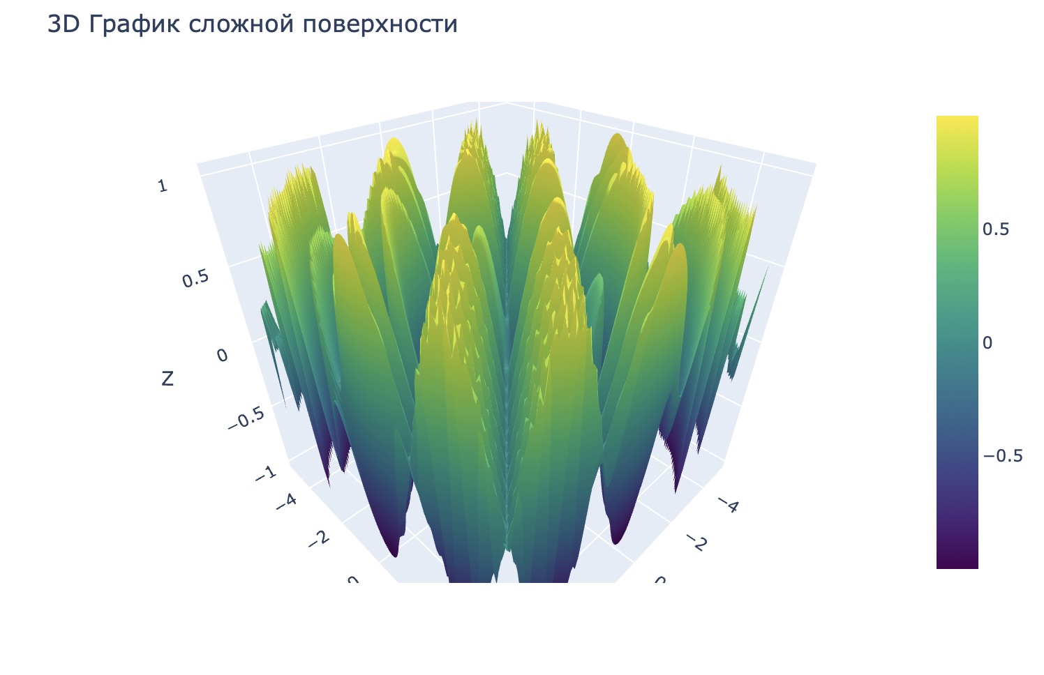 Z = np.cos(X**2 + Y**2) * np.sin(X – Y) # Сложная функция