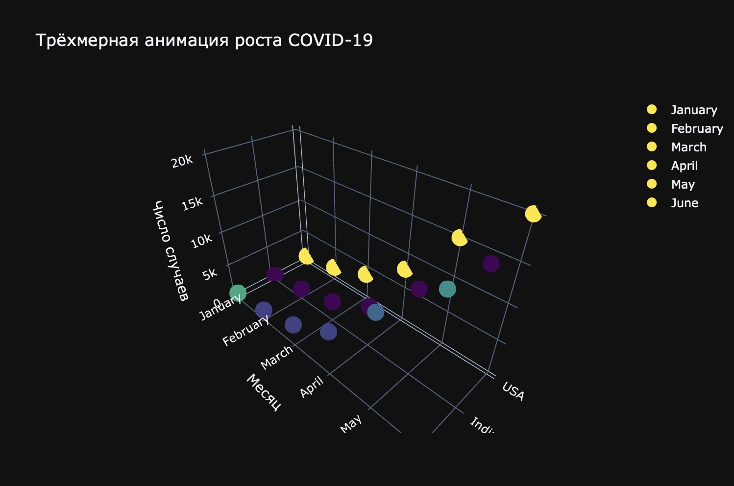 Создайте трёхмерную анимацию, показывающую рост числа случаев по месяцам.