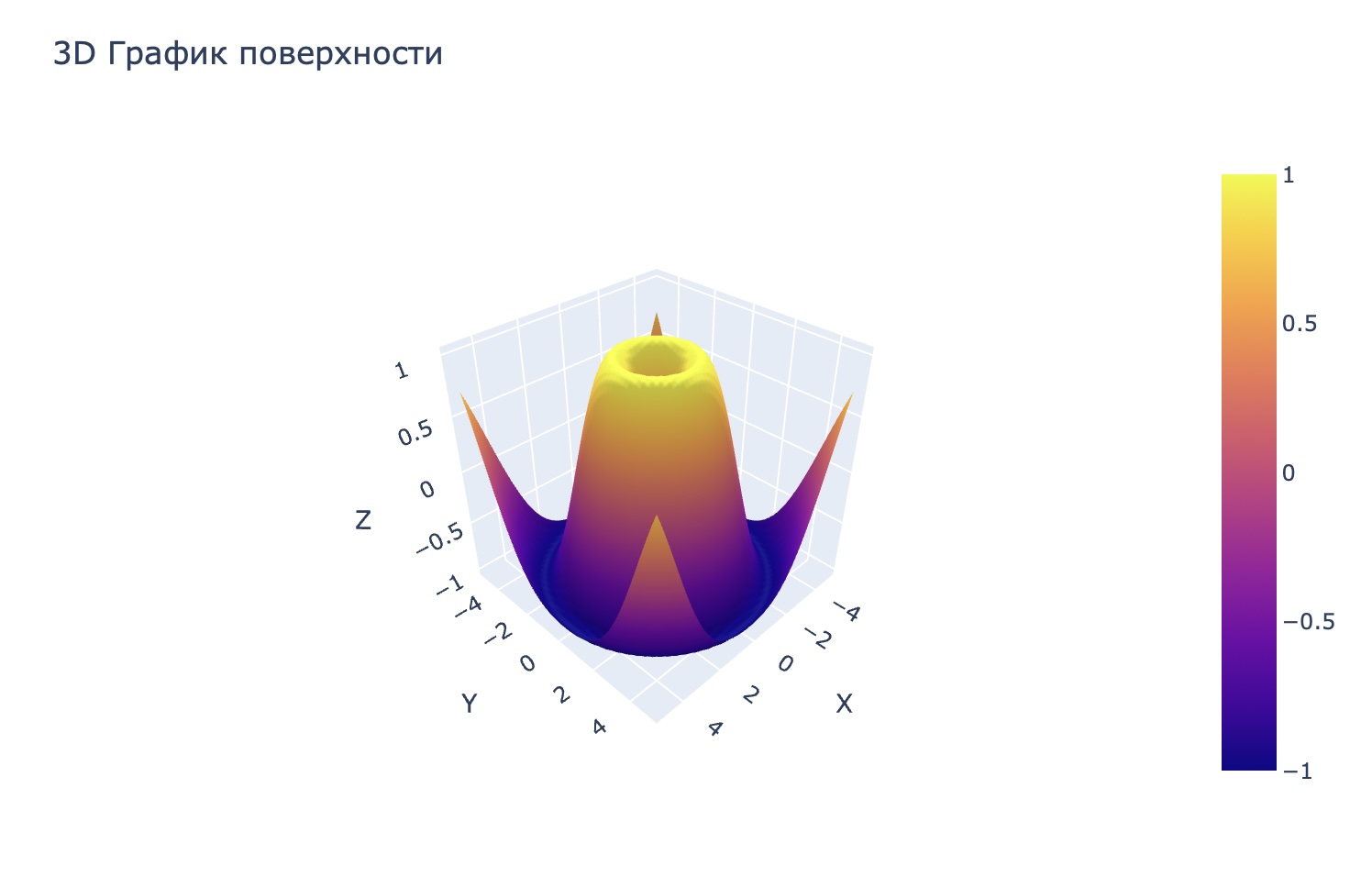 fig = go.Figure(data=[go.Surface(z=Z, x=X, y=Y, colorscale='Viridis')]) # Изменение цветовой гаммы