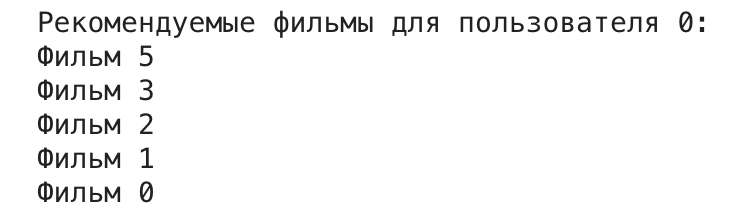 Пример использования демонстрирует, как получить рекомендации фильмов для определенного пользователя. Результатом программы является список идентификаторов фильмов, которые рекомендуется пользователю с указанным идентификатором.