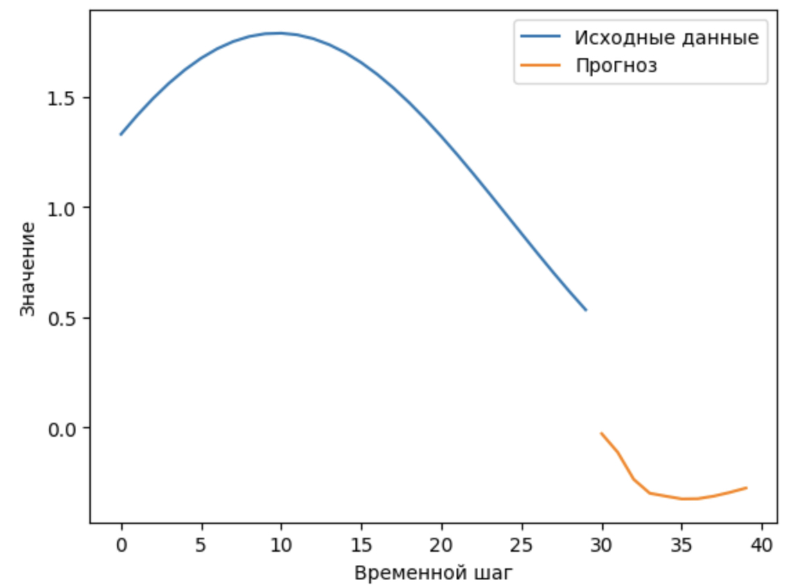 2. Прогноз (оранжевая линия): Это результаты прогноза, сделанные моделью RNN на будущее. Модель обучается на исходных данных и затем пытается предсказать значения временного ряда на заданное количество временных шагов вперед (future_steps).