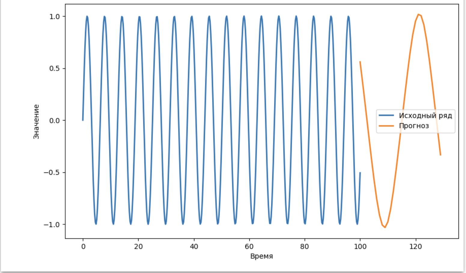 Из этой визуализации видно, что модель LSTM смогла захватить основные характеристики синусоидального временного ряда и предсказать его продолжение на будущее. Этот пример демонстрирует, как LSTM может использоваться для анализа и прогнозирования временных рядов, а также как она учитывает долгосрочные зависимости в данных.