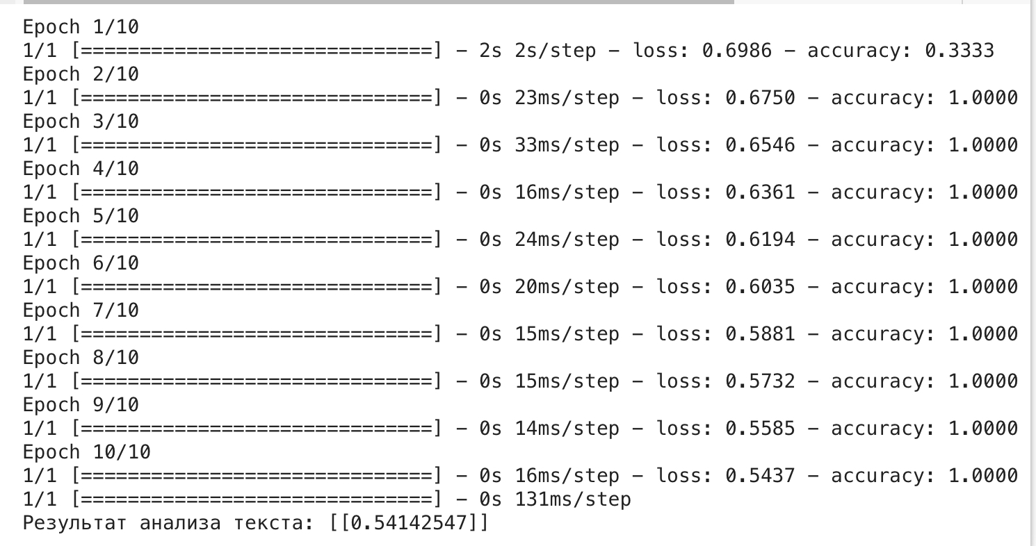 В данном примере результатом будет число от 0 до 1, которое показывает вероятность положительного обзора. Например, если результат равен 0.85, это означает, что модель оценивает текст как положительный с вероятностью 85%. Если результат близок к 0, это означает, что текст скорее всего отрицательный, а если близок к 1, то текст скорее всего положительный.