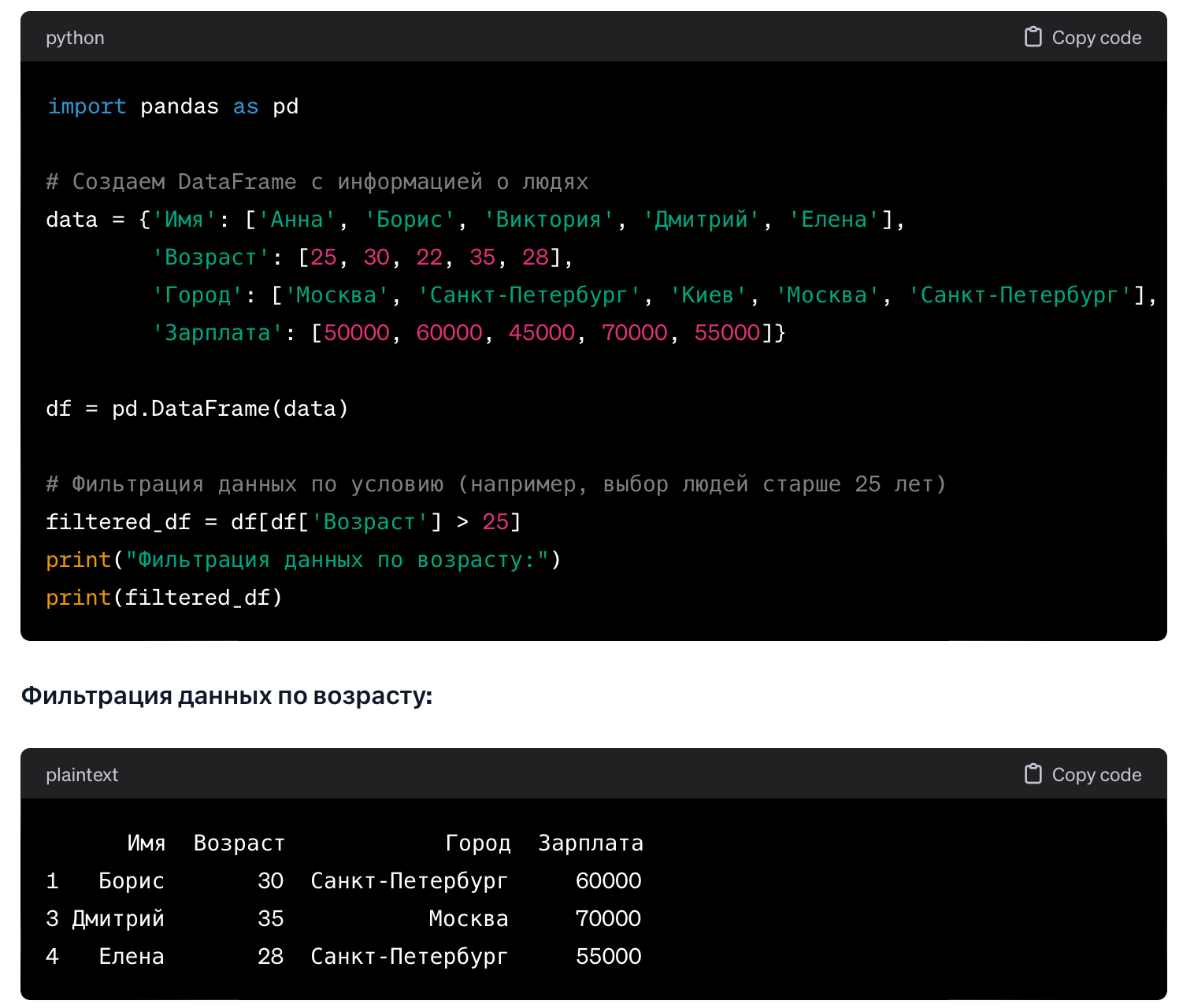 DataFrame можно создать из различных источников данных, таких как списки, словари, массивы NumPy, CSV-файлы и многие другие. Рассмотрим несколько примеров.