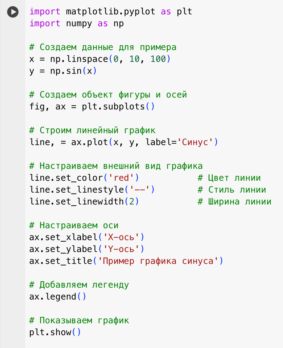 – Построили линейный график синусоиды с помощью `ax.plot()`.