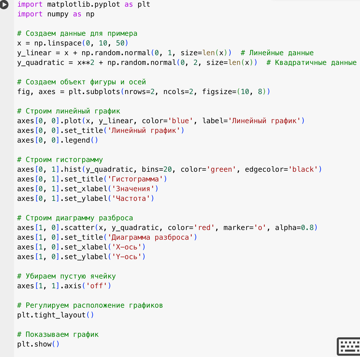 Давайте рассмотрим пример создания различных типов графиков с использованием Matplotlib. В этом примере мы построим линейный график, гистограмму и диаграмму разброса на одной фигуре.