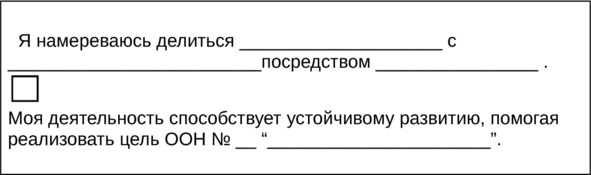 После выполнения этих трёх шагов, у нас появилась некоторая матрица, из которой мы можем комбинировать различные варианты идей для своего дела, заполнив данное предложение: Я намереваюсь делиться _ (Шаг 1) _ с __ (Шаг 2) _ посредством __ (Шаг 3) _. Например, «я намереваюсь делиться любовью с предпринимателями посредством обучения» или «я намереваюсь делиться здоровьем с людьми из Минска посредством создания команды фермеров-единомышленников».