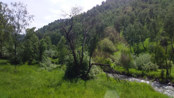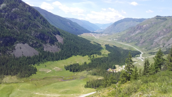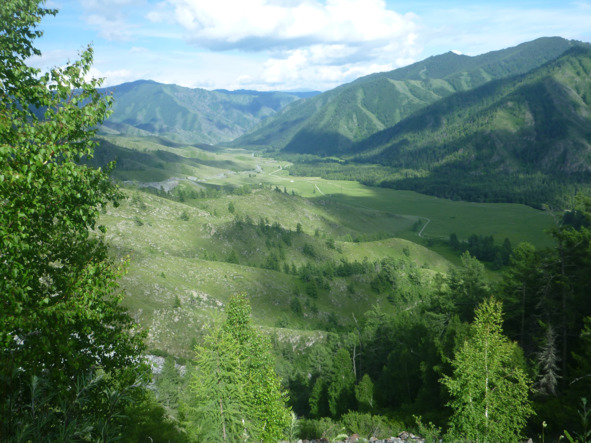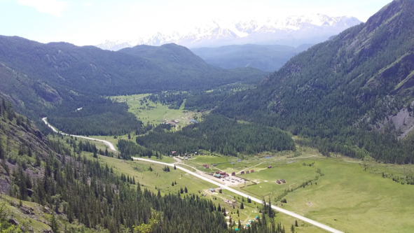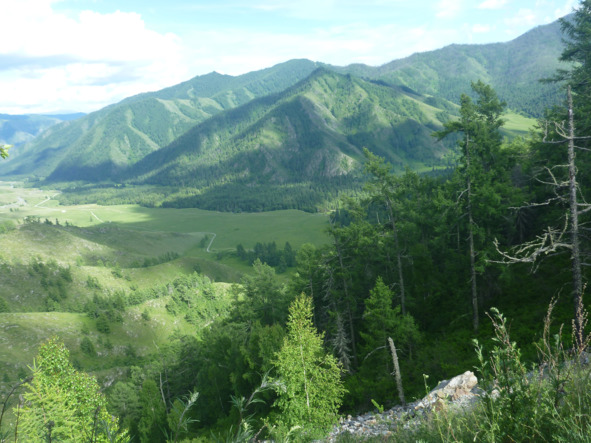 Теперь наша цель – совершить свой первый подъем по отрогу Курайского хребта. Это в каком-то смысле тест для всех нас. В группе собрались люди разных возрастов – от пионеров до пенсионеров, физическая подготовка тоже у всех разная. Кто-то бодро бежит вверх по тропе, а у кого-то перехватывает дыхание и темнеет в глазах. Поднимаемся до смотровой площадки и нашему взору открывается умопомрачительный вид на Северо-Чуйский хребет и долину. Далеко внизу узкой лентой серебрится Катунь, а домики на турбазе кажутся совсем крохотными. Удержаться от фотосьемки просто невозможно- настолько все свежо и живописно! Весна в этом году на Алтае поздняя, поэтому трава сочно-зеленого цвета, тут и там попадаются жарки, дикие маки и другие цветы.