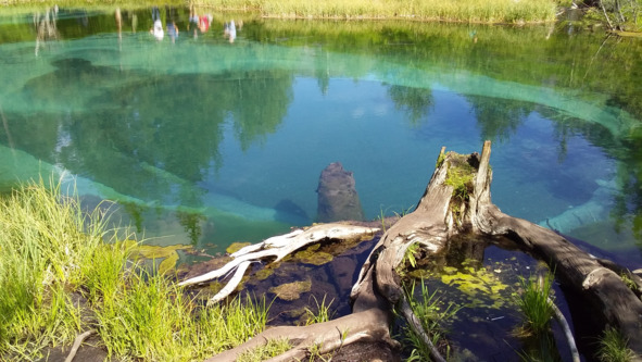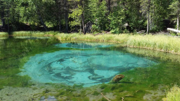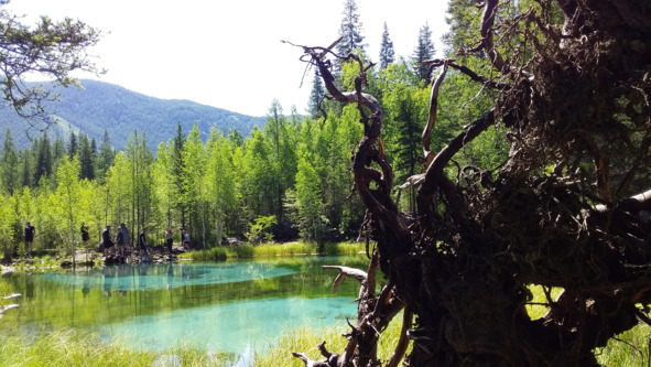 Гейзеровое озеро уникальное по своей природе, образовалось в результате землетрясения и знаменито тем, что постоянно меняет свой рисунок. В озере запрещено купаться, чтобы не нарушить хрупкую экологию этого места. Путь к озеру проходит по деревянному настилу, затем по лесной тропе. Мне это озеро своими очертаниями и рисунком напоминает распил уральского малахита. Неторопливо обхожу озеро вокруг, ищу интересные ракурсы для фотосьемки и делаю фото на память. Вдоволь налюбовавшись, возвращаемся к нашему КАМАЗу.