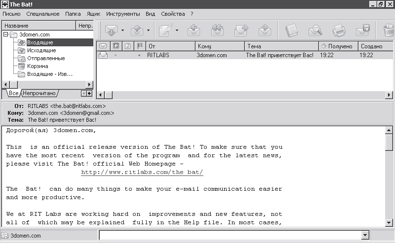 The Bat! (рис. 1.1) прошла путь от простой почтовой программы до мощной системы управления электронной почтой: она имеет встроенный модуль шифрования сообщений методом PGP, антиспамовый фильтр, систему фильтрации.