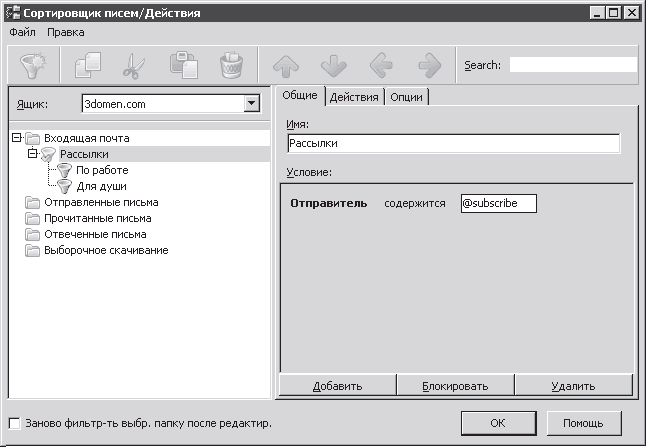 В модуле для сортировки можно управлять фильтрами. Фильтры можно копировать и перемещать в другие категории. Кроме того, появилась система подфильтров, создаваемых в рамках фильтров. Подфильтры – это расширения фильтров, позволяющие задавать дополнительные условия сортировки. С их помощью можно более логично организовать почтовые сообщения (рис. 1.3). Удобным также является то, что все подфильтры, объединенные одной темой, могут храниться в одном месте, то есть в рамках общего фильтра.