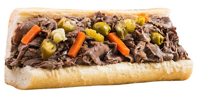 Это культовое блюдо чикагской кухни представляет собой сэндвич в итальянском стиле. По традиции он состоит из хорошо приправленных тонко нарезанных кусочков ростбифа, которые помещают в пышную итальянскую булочку. Сэндвич также сдабривают либо жардиньерой, то есть итальянскими маринованными овощами, либо кусочками жареного сладкого перца. Перед подачей сэндвич пропитывают ароматным соусом. В зависимости от личных предпочтений сэндвич дополняют такими сырами как моцарелла, проволоне или чеддер.