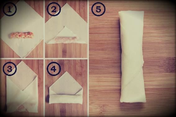 Расположить несколько листов теста так, чтобы один из углов был по направлению к вам. Поместить чуть выше этого угла 2 ст.л. начинки и разравнять руками, превратив ее в небольшой рулетик. Плотно свернуть тесто и сформировать спрингролл, смазав верхний угол мучной водой, после чего заклеить его. Повторить процедуру со всеми листами теста.