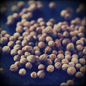 Кориандр лучше всего использовать в качестве зерен, нежели молотым. Спелые зерна имеют теплый, ореховый, немного древесный аромат и сладкий, чуть терпкий вкус, с цитрусовыми нотками. Цельные зерна кориандра почти всегда прогревают на сухой сковороде перед закладкой в блюдо. Исключением является выпечка и десерты – в этом случае они не нуждаются в прогреве. Кориандр является отличной моноспецией и сочетается со многими пряностями, поэтому он является одной из самых популярных ингредиентов в пряных комбинациях. Эта специя является главнейшим компонентом всех видов порошка карри. Практически все ближневосточные и африканские смеси также основаны на этой пряности (дукка, арисса, рас-эль-ханут и прочие). На левой фотографии – европейский кориандр, на правой – индийский.