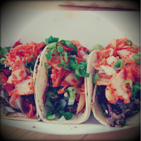 Этот вид уличного блюда представляет собой фьюжн корейско-мексиканской кухни, популярный в США и Канаде. Оно включает в себя мексиканский стиль приготовления тако на основе лепешки тортильи с восточноазиатским стилем приготовления начинки, состоящей из бульгоги (корейский вид барбекю) и кимчи (острая квашенная пекинская капуста). Зародившись в Лос-Анджелесе это уличное блюдо стало популярным во многих городах Северной Америки. На данный момент не менее популярным является буррито по-корейски. Вы можете купить уже готовый кимчи или приготовить его сами по рецепту, который я привел в конце книги.