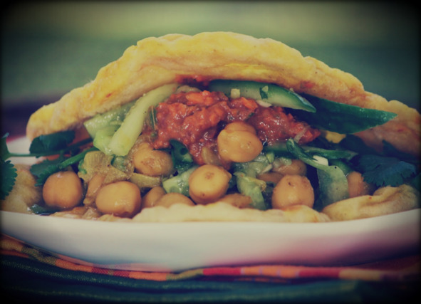 – Для сервировки сэндвича поместить 2 ст. л. нутовой начинки на лепешку, сверху добавить кучела и немного огурца, а затем смазать необходимым количеством жгучего соуса. Накрыть сэндвич второй лепешкой и повторить сборку блюда с остальными лепешками.