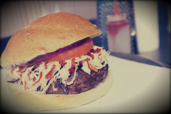 – Расположить на нижней части булочки, котлету, а сверху поместить лук, помидор, капусту и немного оставшегося соуса. Сразу же подавать.