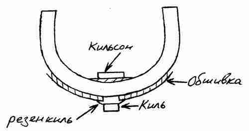 А еще есть РЕЗЕНКИЛЬ. Он расположен между килем и обшивкой днища, сбоку в нем специальные вырезы – ш п у н т ы. В них входят нижние края корабельной оболочки – о б ш и в к и. Если хотите, я нарисую. Вот…