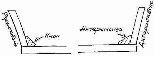 А что касается привальных брусьев, то они задними концами прикрепляются не к ахтерштевню, а именно к транцу. И некоторые стрингера тоже. А между транцем и привальными брусьями ставятся кницы. Сверху это выглядит вот так:
