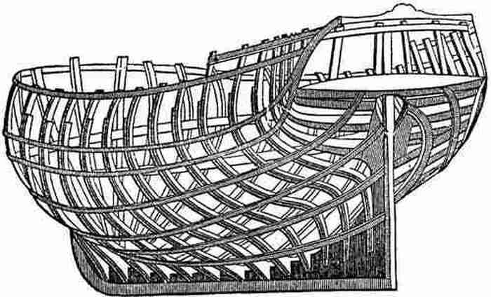На концах киля ставятся штевни: на носу – ф о р ш т е в е н ь, на корме – а х т е р ш т е в е н ь. Поверх киля кладется р е з е н к и л ь, по всей длине которого сделаны вырезы (шпунты) для нижнего края обшивки. На киль с резенкилем ставятся корабельные ребра – ш п а н г о у т ы. Это – поперечные связи. По ним протягиваются от штевня к штевню продольные связи – с т р и н г е р а. А внизу, на флоры, которые соединяют левые и правые ветви шпангоутов – тимберсы, – над резенкилем, кладется к и л ь с о н.