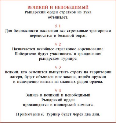 Это Серёжа придумал, что у каждого участника турнира должен быть оруженосец. Для малышей из шестого отряда такое дело – самое подходящее. Стрелки́ из них никудышные: им и лук-то не натянуть как следует, а за улетевшими стрелами бегать они могут. И вообще, мало ли какая помощь потребуется во время турнира. Сразу и не угадаешь. А оруженосец всегда под рукой. Скажешь – и он сделает что нужно.