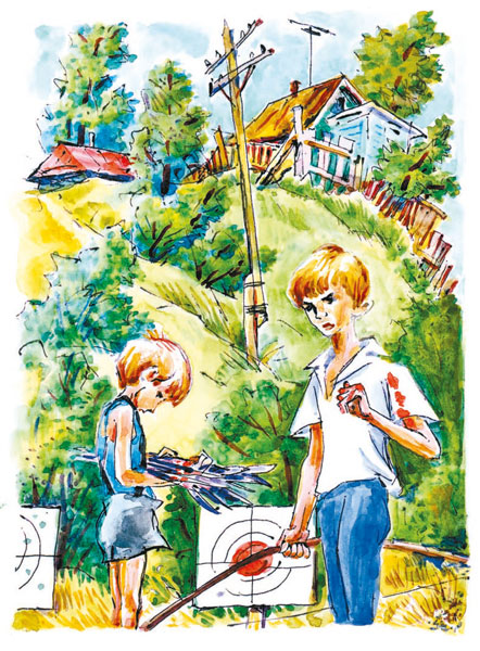 Горнисты ещё не сыграли побудку, и над лагерем висела сонная тишина. А солнце стояло уже высоко. Жестяные наконечники стрел, глубоко вонзившиеся в берёзу, горели серебряными точками.