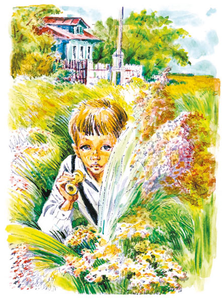 На самом деле это была не катушка, а волшебная подзорная труба. Поднесёшь к глазу – и видишь, как в светлом кружке обыкновенная трава превращается в заросли сказочного леса. Переплетение узорчатых листьев, колосьев и цветов сразу становится громадным. Потому что смотришь снизу – травы убегают к горизонту и сливаются с настоящим лесом.