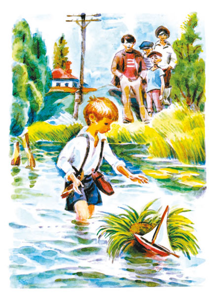 Кашка заморгал и убрал от глаза катушку. Море превратилось в крошечное луговое озерко. Но парусник не исчез. Кашка приподнялся на локтях. Одномачтовый кораблик бежал к берегу, где горели на солнце жёлтые лютики. Парус был похож на косое крыло голубя. Кашка встал в полный рост. Тогда он услышал голоса и увидел хозяев парусника.