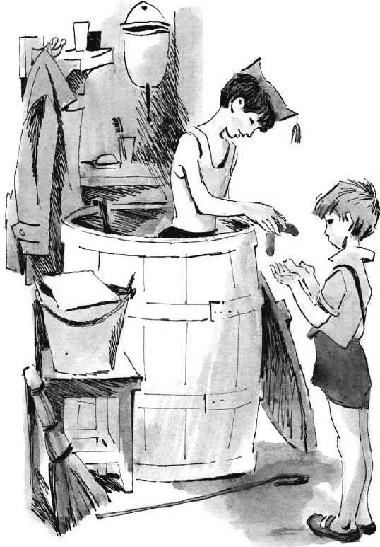Я засучил до плеча рукав, лег животом на край бочки и попытался выловить подводную лодку. Где там! Разве дотянешься до дна… Тогда я принес кочергу и долго бултыхал в бочке, стараясь зацепить потонувшее глиняное судно.