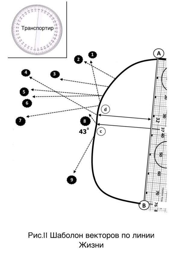 Изготовление шаблона. Убираем общий фон ладони и транспортиром измеряем градусы углов, образующихся при пересечении направляющей AB и векторов (отм.1—9 рисунок 11 страница 26). Точка с соответствует 43 градусам.