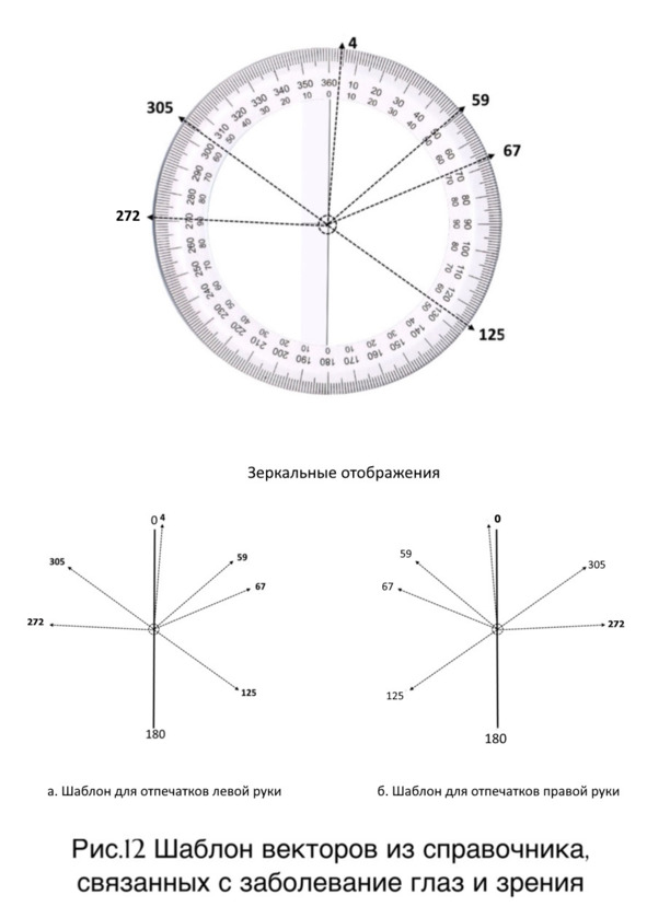 Шаблон векторов глазных заболеваний (рисунок 12 страница 27) изготавливается самостоятельно, соотносятся с шестью показателями, а именно: 4, 59, 67, 125, 272 и 305 градусами (полное писание градусов даны на страницах 35, 70, 75, 112, 212 и 236). При соотнесении данных по шаблонам выявляется совпадение на 67 градусе с точкой d (отм. 4 рисунок 13 страница 28).