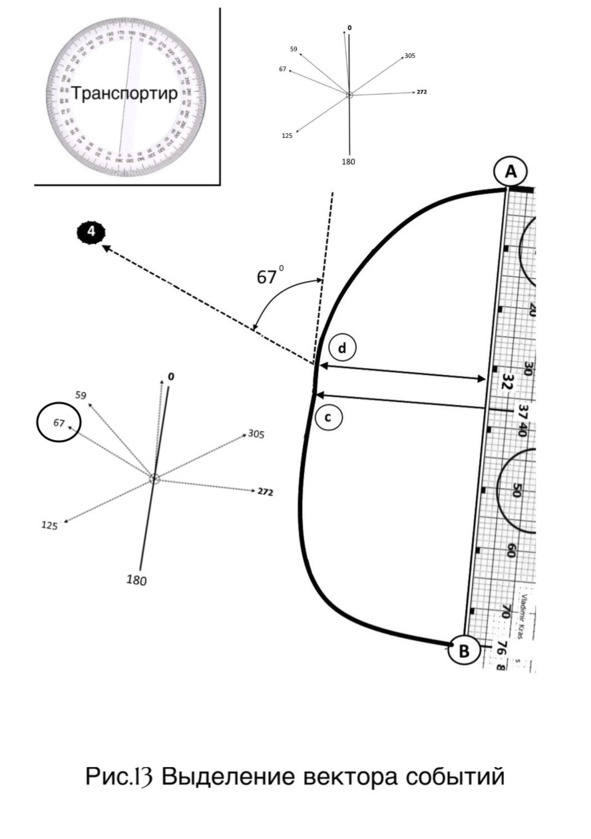 На линии жизни отмечаем событие, это точка с (женщина ослепла), соответствующая возрасту 37 лет (рисунок 9 страница 24). Далее, по линиям событий (дополнительным) проводим вектора. Точка «с» совпадает с началом одного из векторов (отм.8 рисунок 10 страница 25).