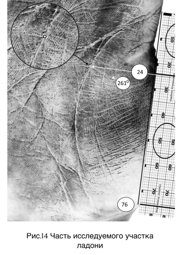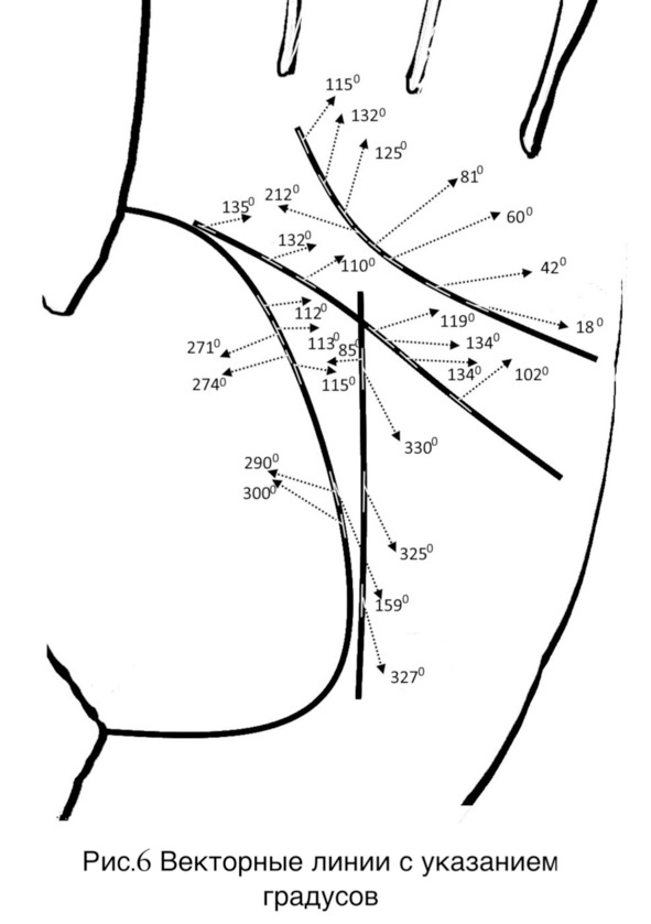 Пример. Вектор под углом 112 градусов в начале на линии жизни (рисунок 6 страница 19). Этот градус находится в области развития (описание на странице 103), и означает, что данному человеку присущи мечтательность, жертвенность, оторванность от реальности. Успех будет достигаться с трудом и придет ближе к середине жизни. Возможность проявить себя в медицине, политике, творчестве. Большая самоотдача в отношениях, сильная привязанность к близким, многодетность. Стоит обратить внимание на состояние органов, содержащих в себе жидкость-желчного пузыря, желудка, лимфатические узлы. С осторожностью относиться к огню и всему, что с ним связано, химическим веществам, пище, так как чревато отравлениями.