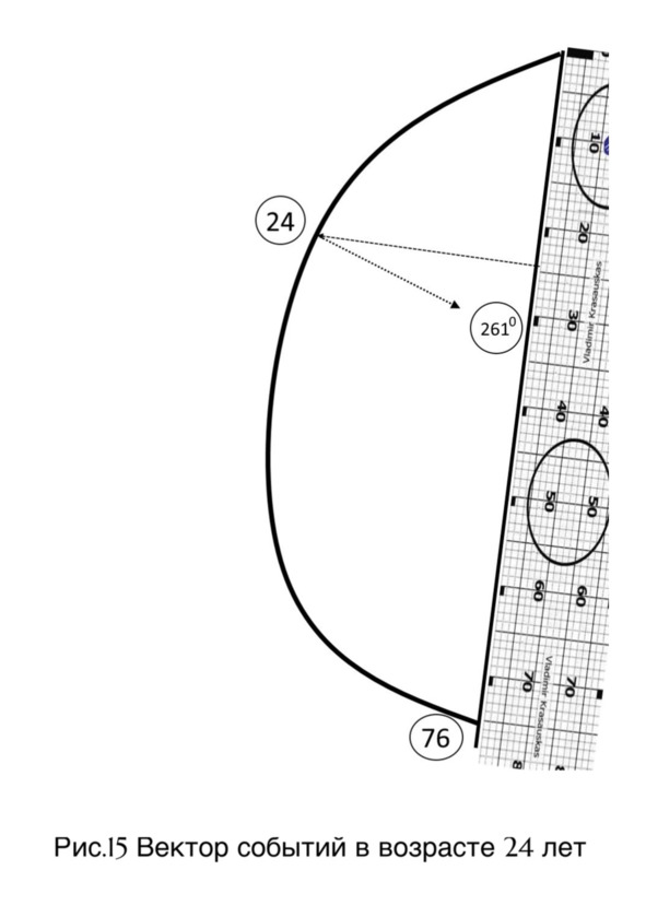 От точки, соответствующей возрасту самоубийства 24 годам проведена линия. Точка ее пересечения с линией жизни соотносится с началом добавочной линии и 261 градусом (рисунок 14 страница 30).
