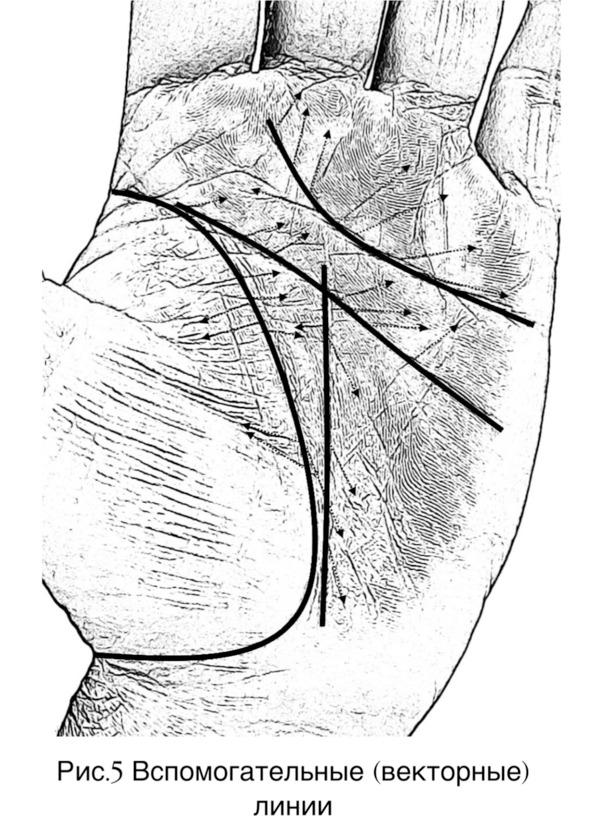 Мелкие, ярко выраженные линии, отходящие от основных (рисунок 5 страница 18). Несут основную информацию (черты личности, события, опасности, наклонности и т.д.). Они располагаются под определенными углами по отношению к основным линиям. Исходя из величин градусов этих углов и использования справочника представляется возможным трактовать эти линии.