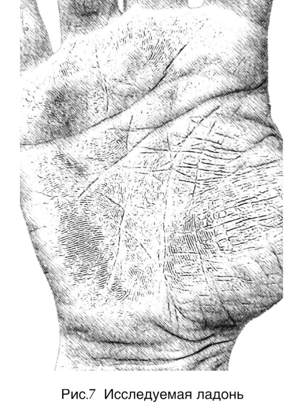 Пример: ЖЕНЩИНА. Родилась 17.01.1982 в Самарской области. В 32 года вышла замуж, в 33 родила. Беременность проходила трудно, в семье в это время были конфликты. В 37 лет ослепла на правый глаз. Частичная атрофия зрительного нерва. Незадолго до потери зрения ей приснился сон- смотрела правым глазом в дверной глазок, видела мутное изображение. Рисунок ладони женщины показан на странице 22.