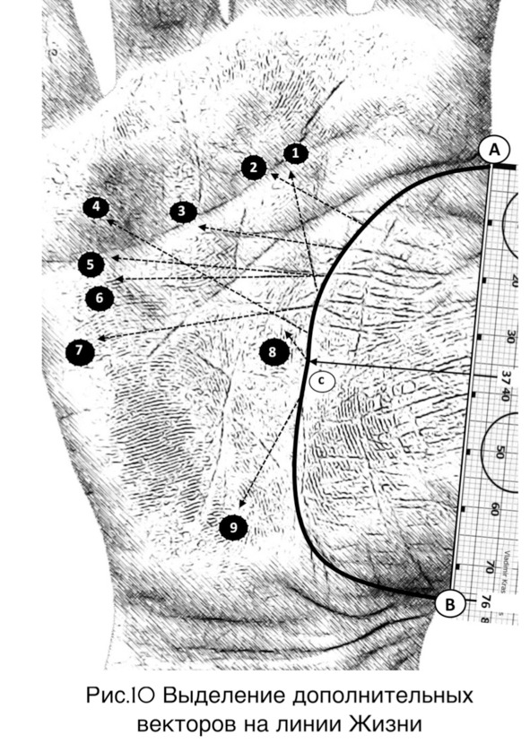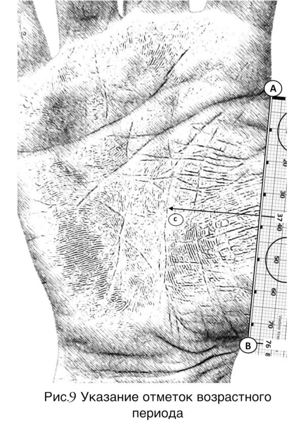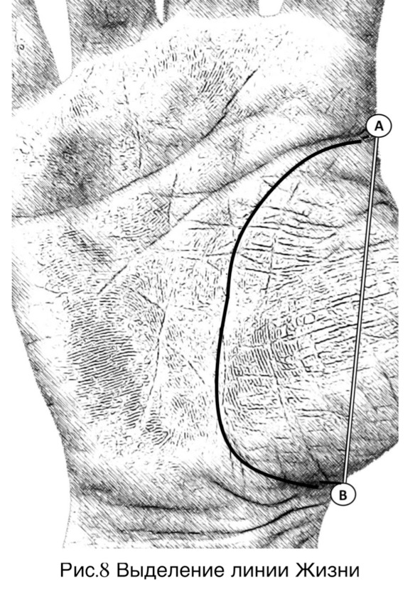 Любым из способов – ручкой, карандашом выделить линию жизни (рисунок 8 страница 23). Точка А– начало, точка В– её окончание. Отрезок АВ– направляющая (соединение точек).
