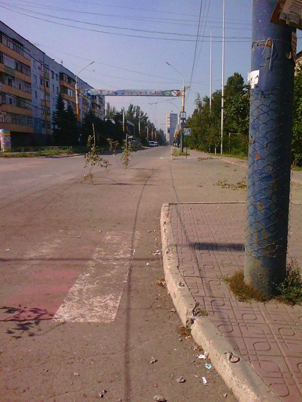 Первый этаж дома рядом с остановкой сильно пострадал от снаряда. Во всём доме вылетели почти все стёкла. Под лоджией первого этажа зияет дыра. В супермаркете «АТБ» напротив стекла тоже вылетели. Работники убирают осколки на улице. Окна заделывают фанерой. Троллейбусные провода висят, совсем низко, к ним прикрепили ветки деревьев, чтобы водители не задели… Часть дороги перегородил срезанный, как гигантским острым тесаком, тополь… Следы от осколков везде: иссечены стены и двери ателье и аптеки, окна зияют пустыми глазницами…